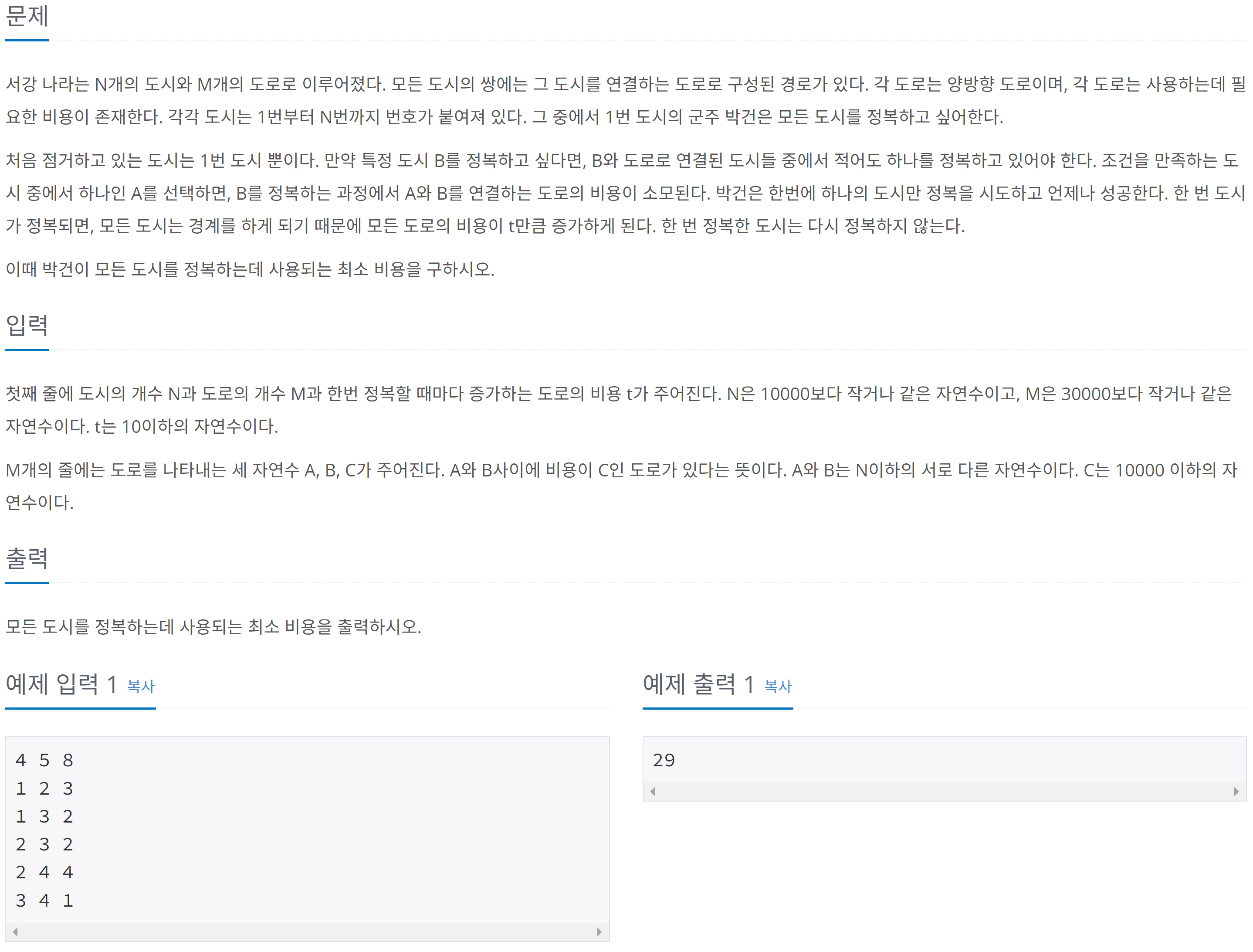 static int t; // 한번 정복할 때마다 증가하는 도로의 비용