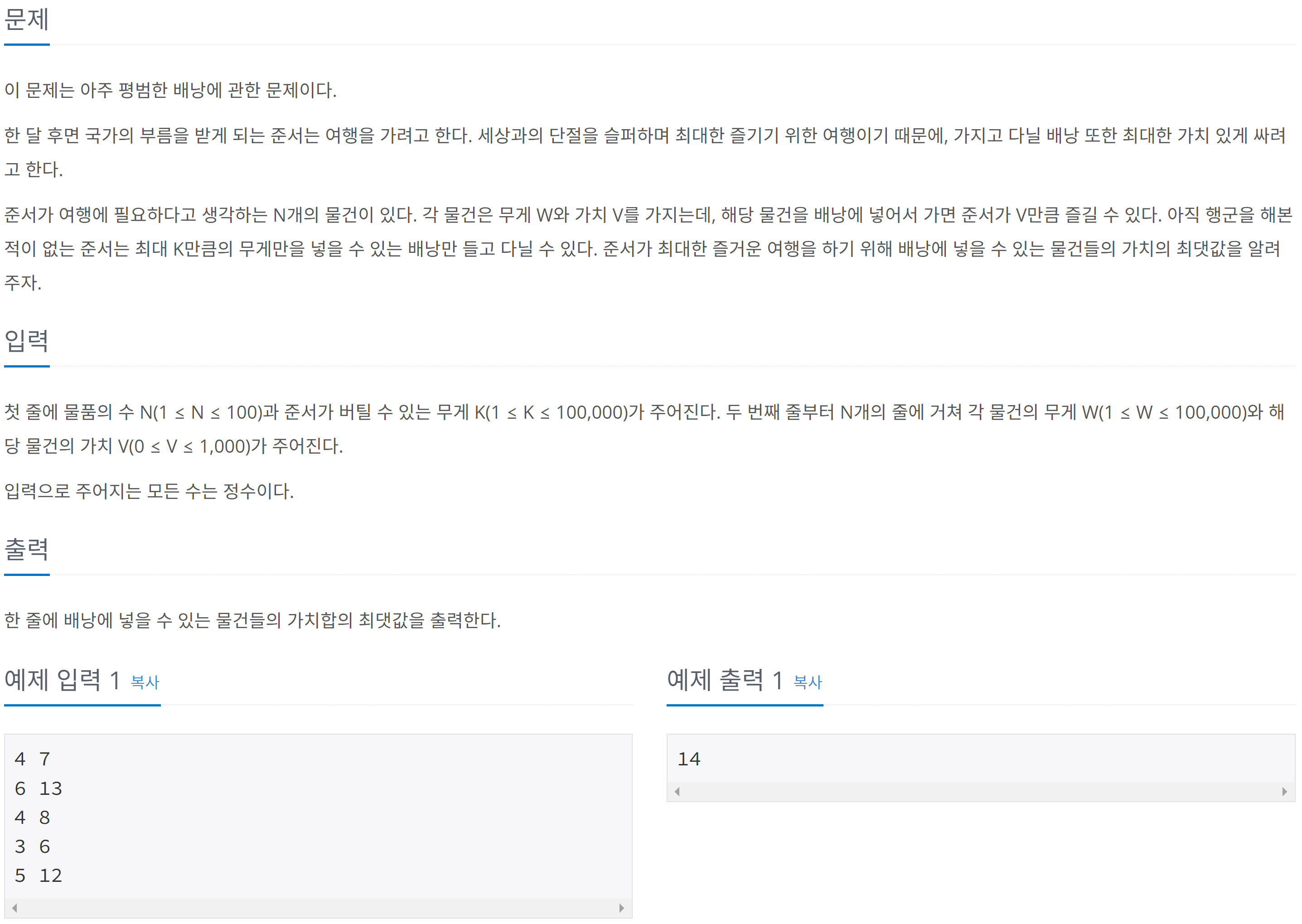 배낭에 넣을 수 있는 물건들의 가치합의 최댓값을 담은 이차원 배열
