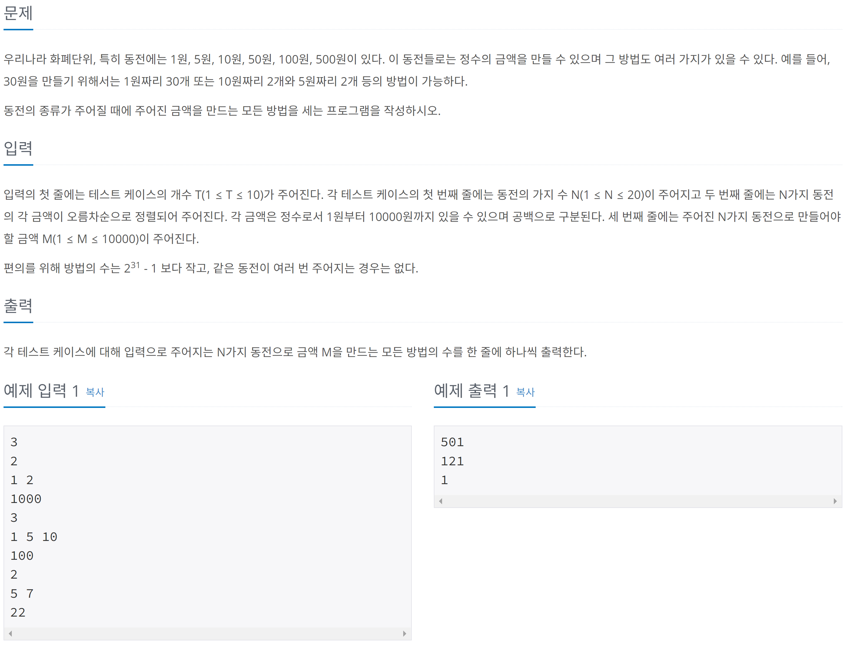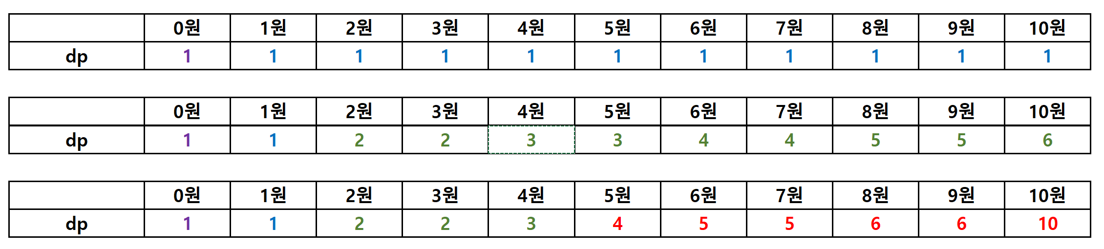 // 어떤 동전이든 0원을 만들 수 있는 가지수는 무조건 1가지 존재 > ex : 1원 동전 0개로 0원을 만들 수 있음