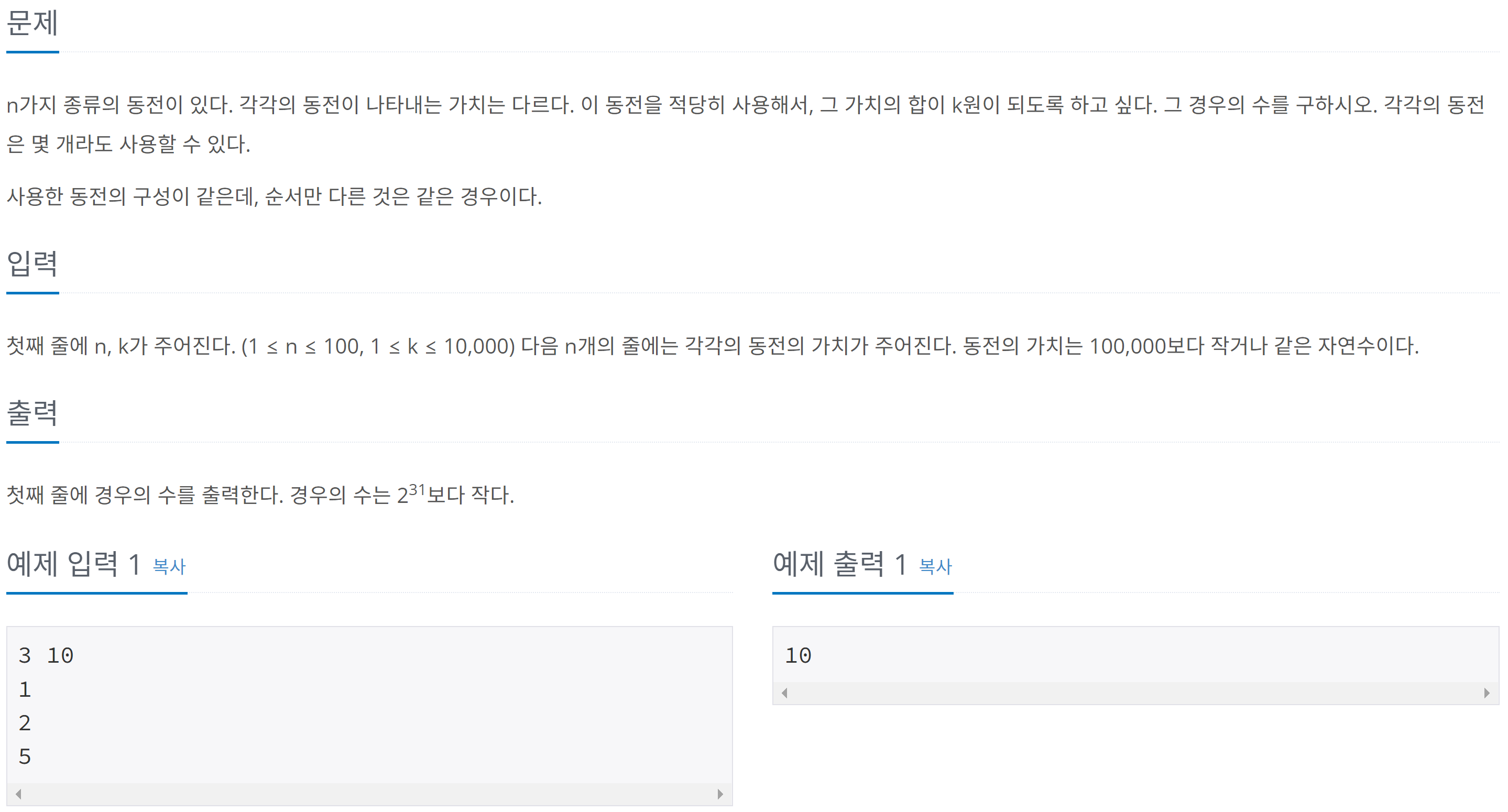 dp[j][h] = dp[j-1][h]; // h원을 만들기 위해 동전 coin[j]를 사용할 수 없는 경우 > 기존에서 추가되는 경우의 수 없음
