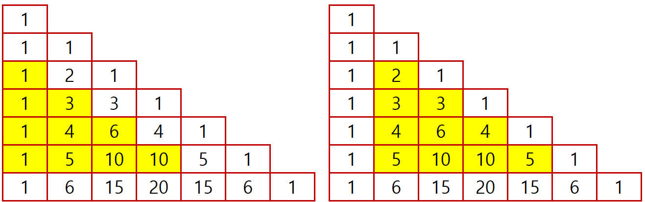 pascal[i][j] = pascal[i-1][j-1]+pascal[i-1][j];