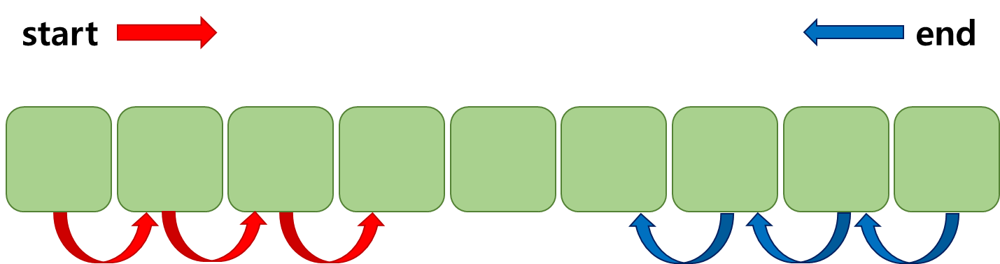> 포인터 2개가 양 끝에서 시작하여 반대로 진행된다