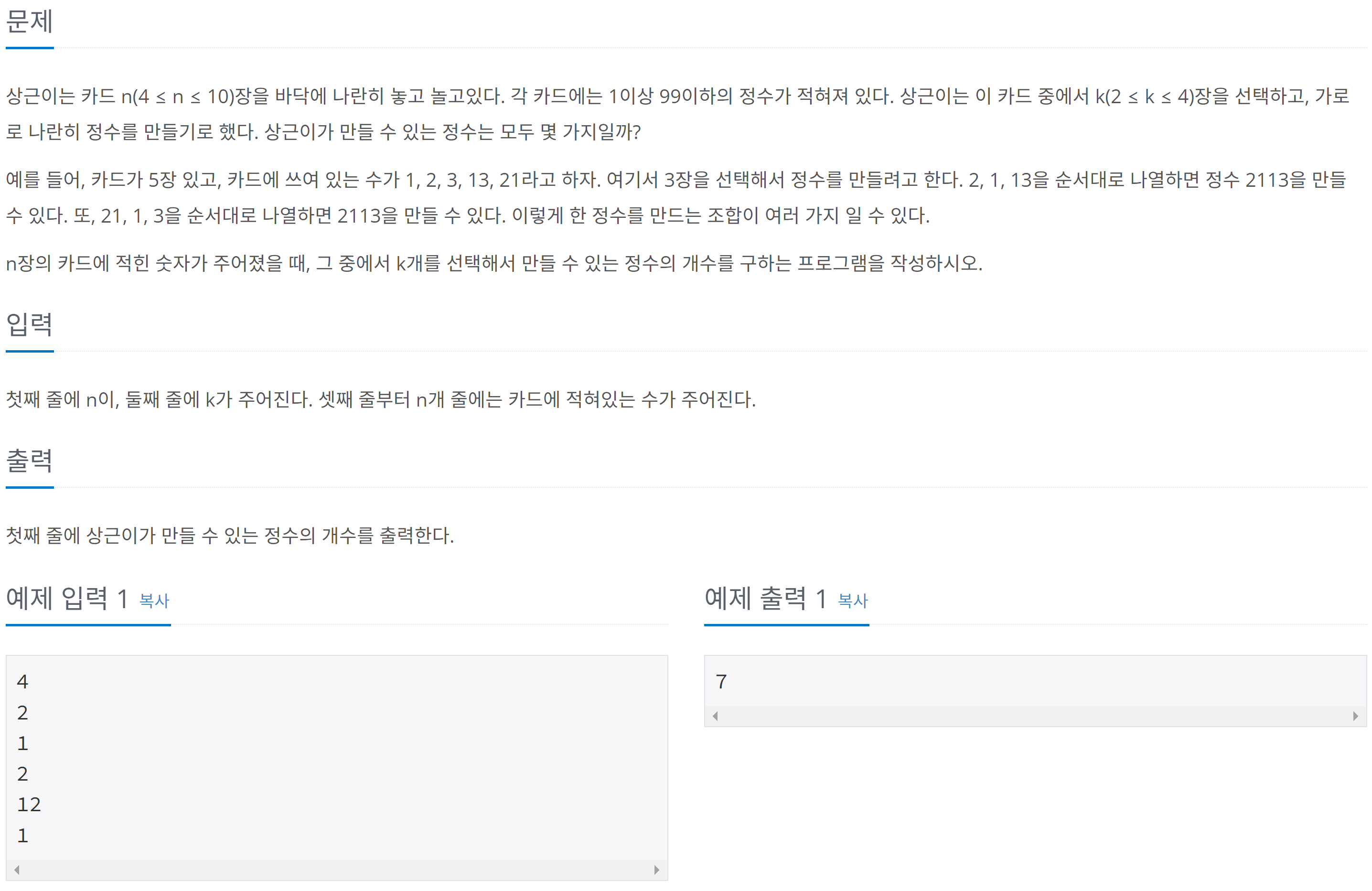 조합과 문자열 결합을 통해 만들 수 있는 정수를 모두 set에 넣는다 (중복 제거)
