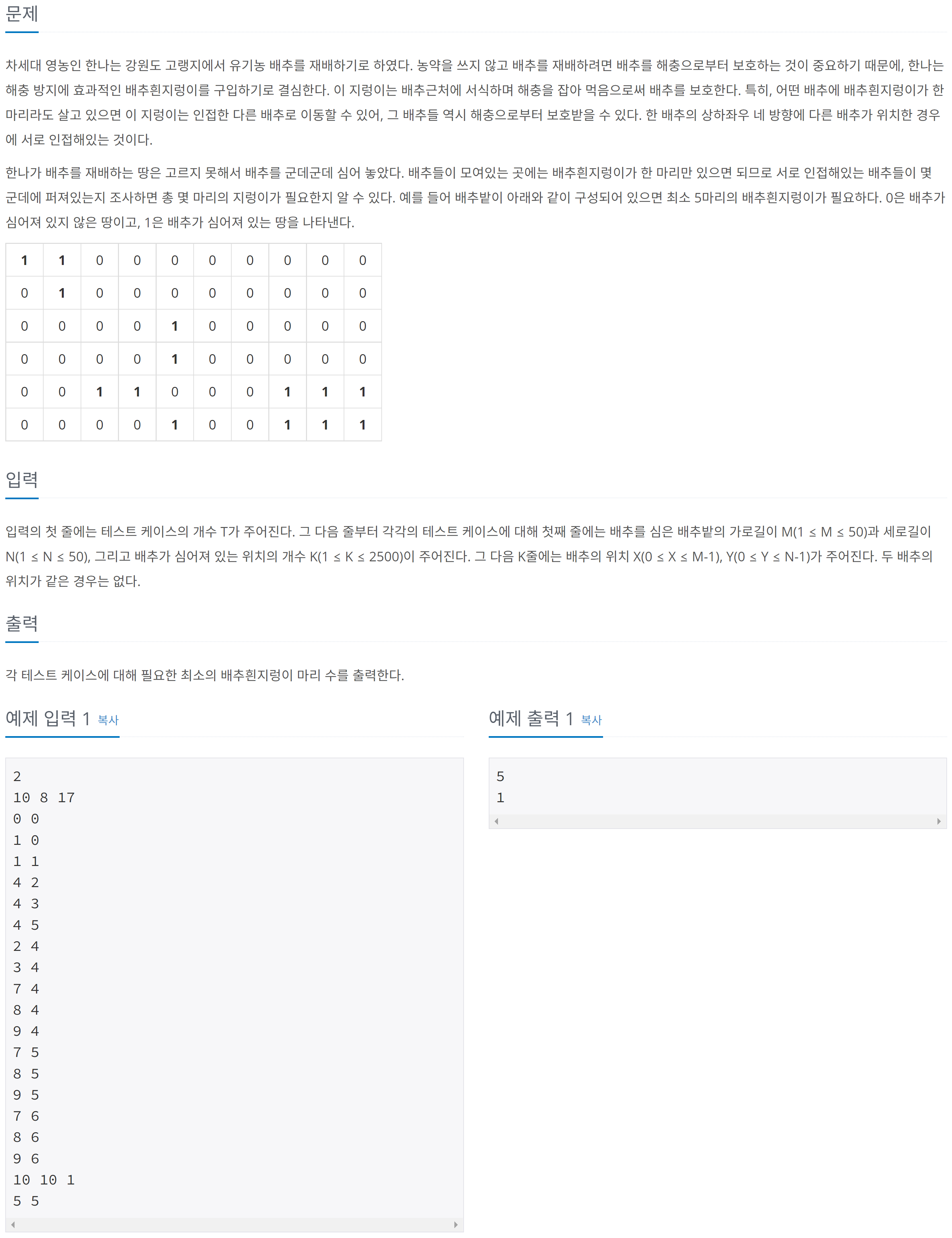 // 배추 있는 칸 = 1, 배추 없는 칸 = 0