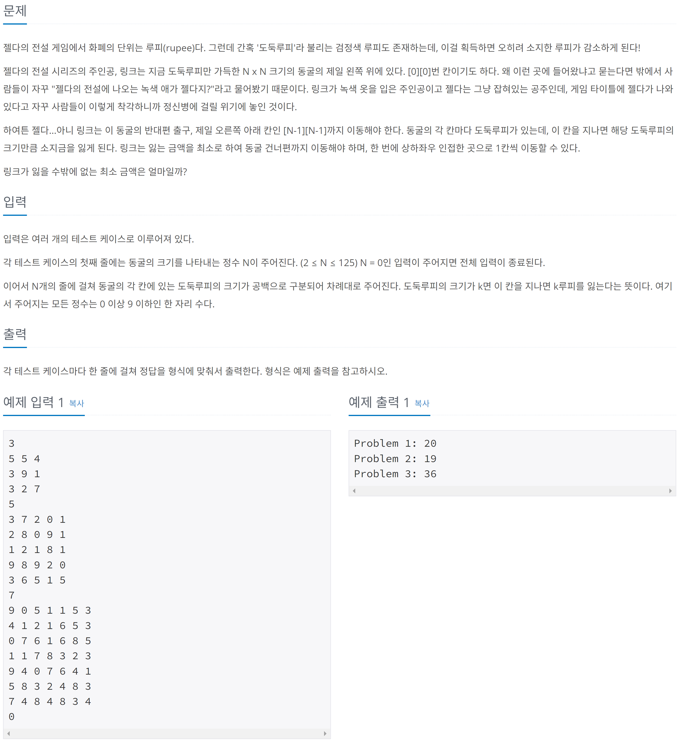 static int[][] graph; // 동굴 내 도둑 루피 정보를 담은 이차원 배열